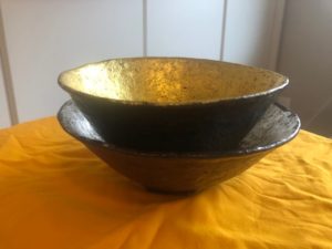 ・銀箔茶碗(高台六角:亀)に金箔茶碗(高台五角:鶴)の重ね茶碗