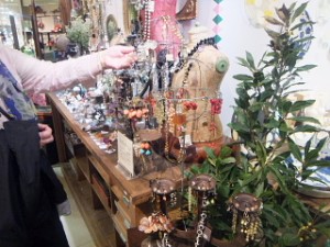 今年は大ぶりのアクセサリーが流行っているそうで、もともと石などの大ぶりアクセサリーは比較的年齢層の高い女性に人気がありますが、ますます人気出そうです。さてこういったアクセサリーは比較的高級な取扱方法が多く、すぐ手に取ることが出来る陳列は空くないですが、この展開は高さを出し、ボリューム感を出したことで、豊富感が感じられ「探す楽しさ」を上手に演じています。女性も多く手に取っていました。陳列方法を変えるだけで立ち寄り率があがりますね 😀
