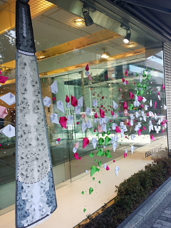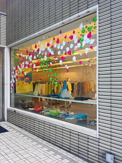 青山ISSEY MIYAKEの前を通ったら、こんなに華やかな明るいウィンドウに仕上がってました!コレクション フェアーと連動している規格のようですが、外から貼られた折り紙のような作りモノ、、とても可愛いけど今日の雪でどうなっちゃうんだろう 🙁 と心配ですね