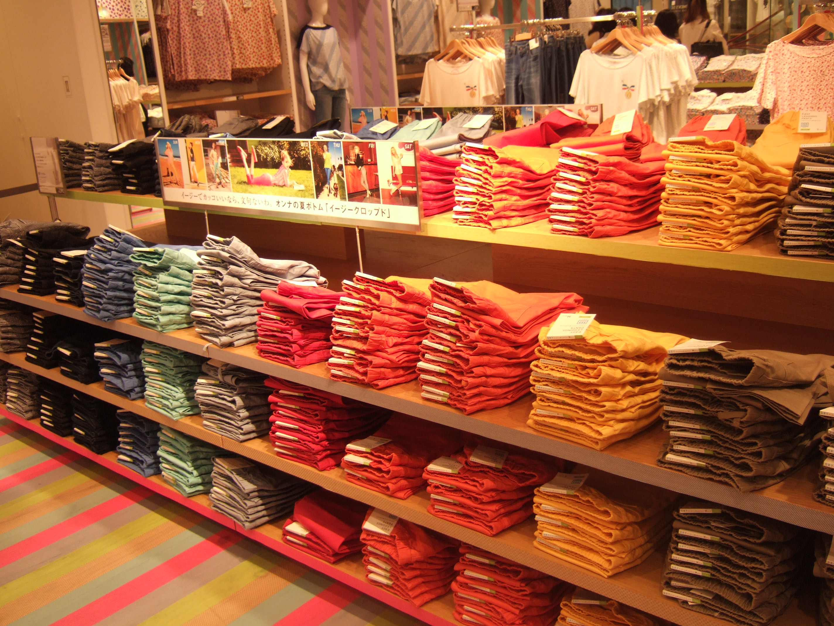 多色展開する商品の陳列方法は意外に難しいものです!ましてセール時期など「色欠け」が乱発し「どうみせるか・・・」頭を悩ますところ。色使いに決まりはありません 😮 色の三原則の基本を思い出して作ってみると、色んなやり方が見えてきます 😀 ユニクロのカラーデニムの展開は上手に色相別やコントラストを差し込み展開しています 😉
