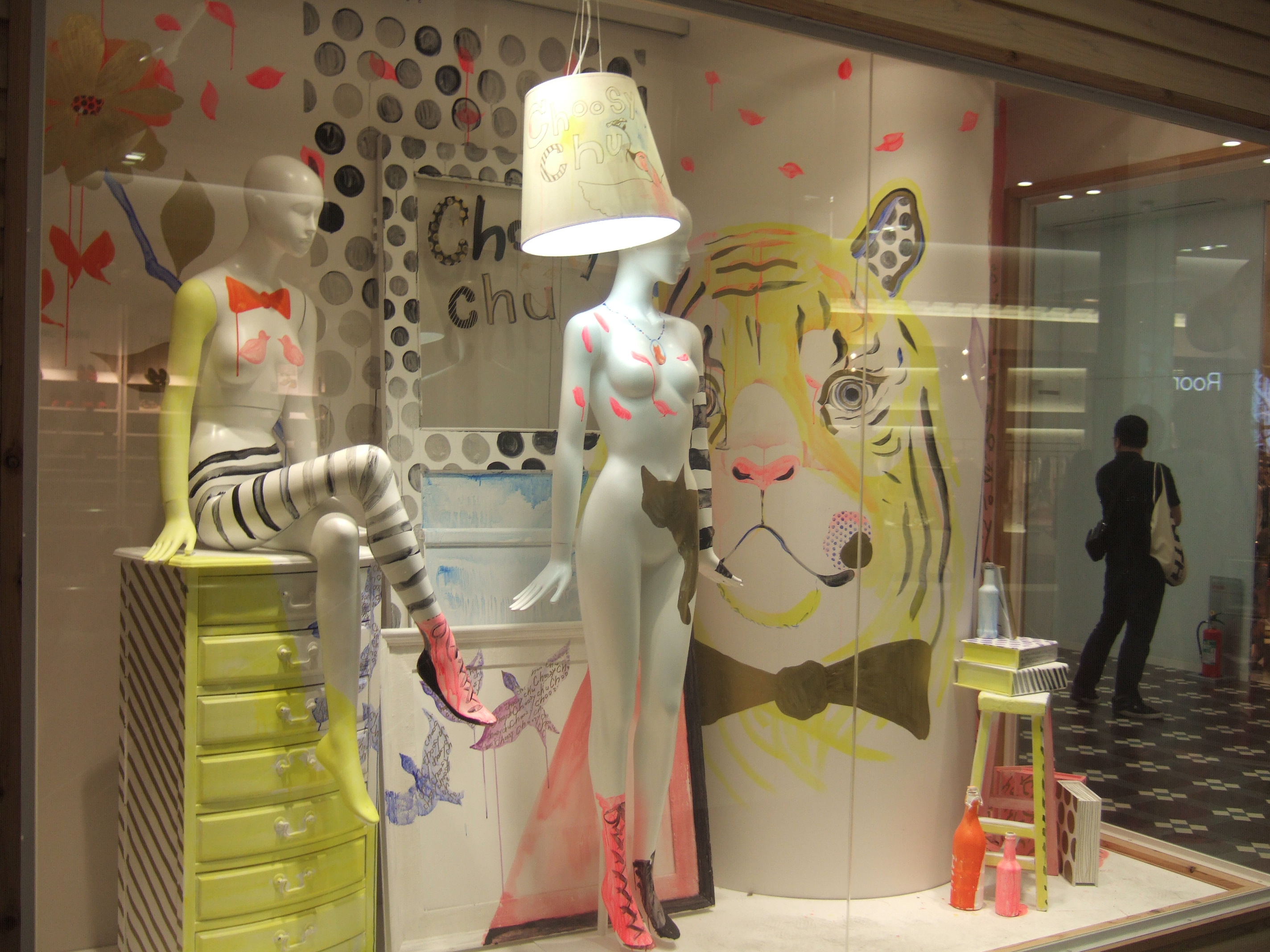 海外に行くと素敵なウィンドウディスプレイがたくさんあります。もちろん日本にも「素敵なウィンドウディスプレイ」がおおくなりました 😉 ウィンドウのサイズや高さ、もちろん取扱品目で内容は変わりますが、やはりしっかり施工すると費用がかかります。逆になんとなくやっている店を見ると店の格が下がって見えてしまい残念 🙁 ・・・大きなウィンドーを維持していくのには費用がかかる事を、内装計画の段階で考慮しておかないと、結局維持が難しくなり最後はやめて売り場にしよう、、、なにて事もあります。東急プラザ表参道原宿内には雰囲気の良いウィンドウディスプレイがたくさんあります!この店もマネキンのペイントを背景にかぶせ雰囲気の良い展開にっていますね 😀