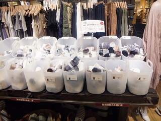 店頭でテーブル展開する店が多い中、雑貨の見せ方に苦労することが多い事があります。平置きだけでは立体的な見せ方が出来ず、陳列用什器を用意しようと思ってもなかなか良いツールがない・・:-( そんな中、良品計画ではこんな展開で肌着などの商品を陳列していました!この陳列方法だと商品量も出すことが出来、分類もしやすい!参考にしたいですね!