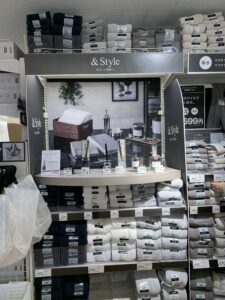 されど色の効果・・・今さら色が与えるイメージなど、古臭いことを言いたくはないが、これはニトリの売り場。っぽく見えないのは、商品色数を絞っていることと、使用するPOPなどの販促ツールも色を絞りカラーテーマをそろえたからでしょう。タオルという、なかなか差別化が難しい商品をどう見せるか、こそVMDの見せどころです