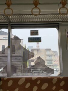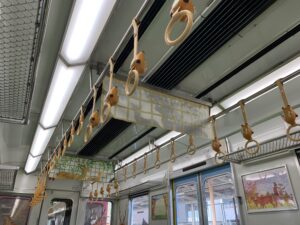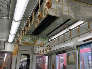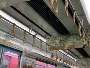 ならしかトレイン、に乗車!!近鉄奈良駅周辺の風景や鹿などをイラストレーター「げみ」氏がオリジナルで書き下ろしたイラストを車両全面にラッピング。鹿の形のつり革や鹿の背中をイメージしたシートと2022年から運行しているそうですが、観光客には撮影したくなる仕掛け満載。