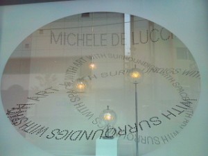 伊勢丹 インテリアデザインウィークのウィンドウ 😉 ガラス面のカッティングシートが額ぶちになり、中の照明スタンドと文字に陰影が出来立体的に見えています。ウィンドウは奥行きが無い分、平面的になってしまうことが多く、こういったカッティングシートでの技法はよく使いますが参考になりますね 😉